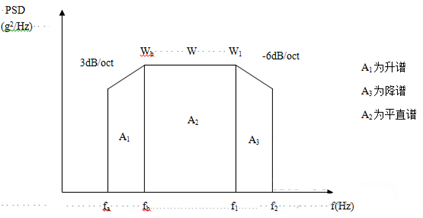 為了簡(jiǎn)便起見(jiàn),往往將功率譜密度曲線圖劃分成若干矩形和三角形,并利用上升斜率(如3dB/oct)和下降斜率(如-6dB/oct)分別算出wa 和w2,然后求各個(gè)幾何形狀的面積與面積和,再開(kāi)方求出加速度總均方根值。